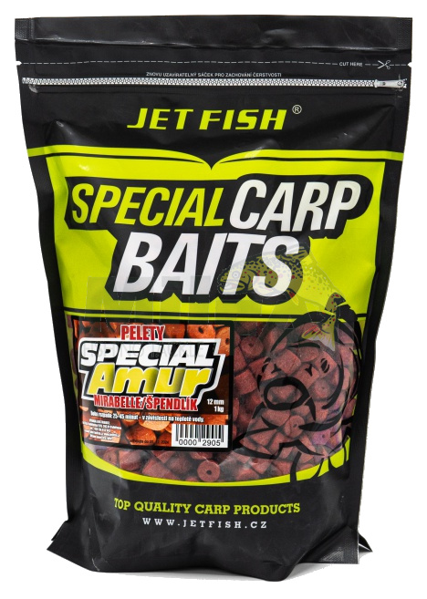 Pelety JET FISH Special Amur Mirabelle / Špendlík je výborná a rychle fungující nástraha, která je zatraktivněna aminokyselinami a extrakty a je přelita boosterem.