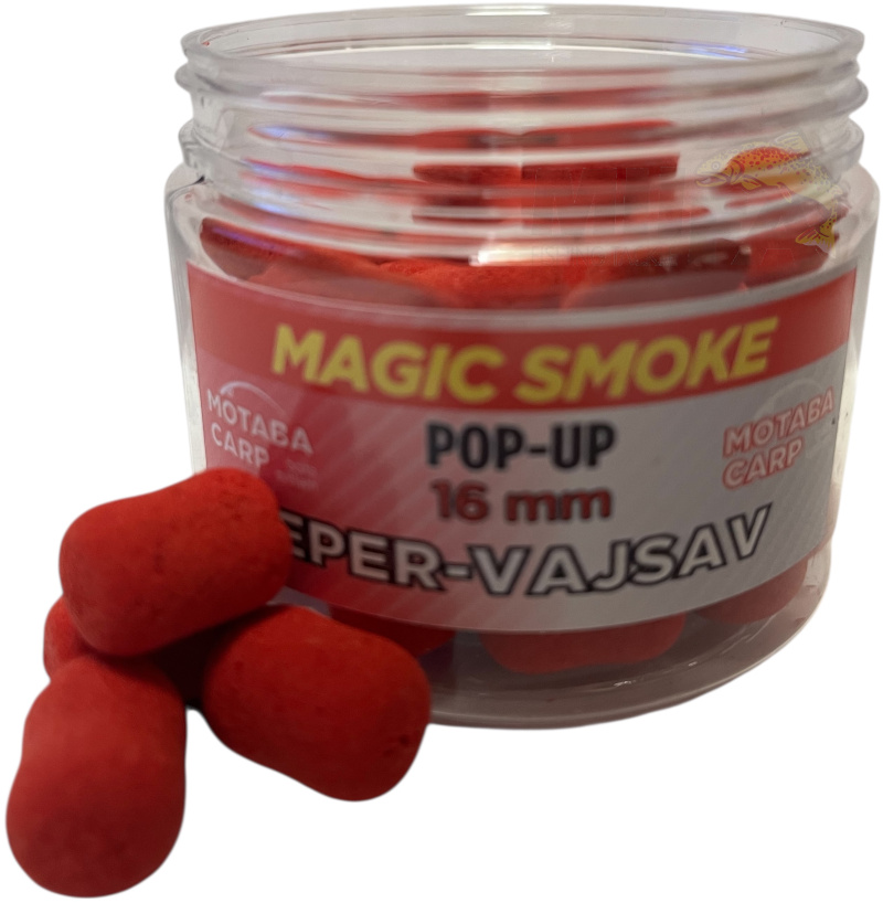 Motaba Carp Magic Smoke Pop-up je plovoucí a zároveň rozpustná návnada, jejímž vztlak byl upraven tak, aby dokázal zvednout háček velikosti 6 na celou přední délku. Silná, ale příjemná aroma charakterizuje celou sérii provázenou mimořádně nápadnými barvami.