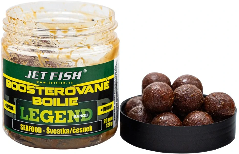 Boosterované boilies JET FISH Legend Range Seafood Švestka česnek je vynikajicí, rychle fungující nástraha, která je zatraktivněna aminokyselinami a esencemi.