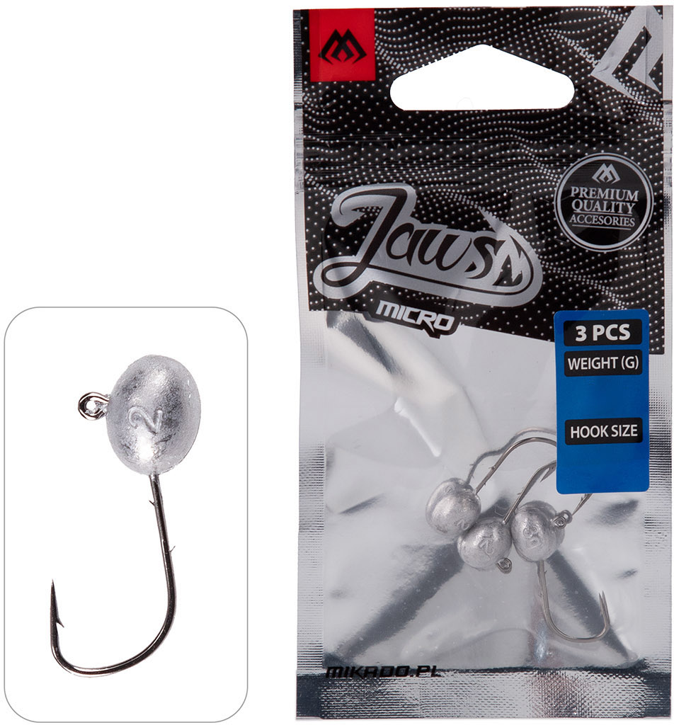 Série jigových hlav Mikado Jaws Micro Jig určených pro rybaření s nejmenšími a nejjemnějšími nástrahami, vybavené extrémně silnými a ostrými háčky, které mají dva mikrohroty, které drží nástrahu a zajišťují ji proti sklouznutí.