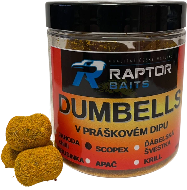 RAPTOR BAITS Dumbells v praškové dipu Brusinka 250ml